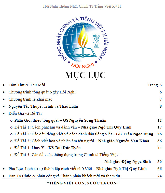 BAN TỔ CHỨC TRÂN TRỌNG LƯU Ý CÙNG QUÝ VỊ. ĐÂY LÀ TẬP TÀI LIỆU HƯỚNG DẪN CHO MỘT HỘI NGHỊ MỞ RỘNG, MỜI GỌI MỌI KHUYNH HƯỚNG GÓP Ý BỔ KHUYẾT ĐỂ TRỞ THÀNH NHỮNG TÀI LIỆU CHÍNH THỨC GÓP PHẦN TRONG VIỆC BẢO TỒN VÀ PHÁT HUY NGÔN NGỮ VIỆT TRONG SÁNG, ĐÚNG ĐẮN. CHÚNG TÔI CŨNG MONG QUÝ VỊ CẢM THÔNG CHO NHỮNG SỰ KHÁC BIỆT, LỖI CHÍNH TẢ HOẶC LỖI ĐÁNH MÁY VÌ SƠ SÓT (NẾU CÓ)